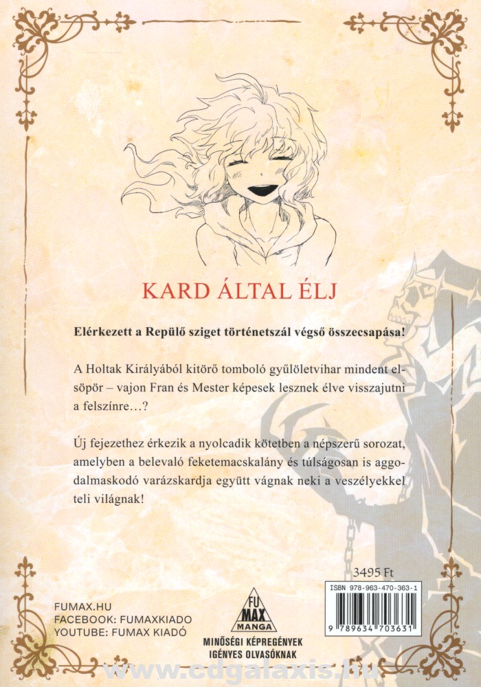 KARD ÁLTAL ÉLJ Elérkezett a repülő sziget történetszál végső összecsapása! A Holtak Királyából kitörő, tomboló gyűlöletvihar mindent elsöpör - vajon Fran és Mester képesek lesznek élve visszajutni a felszínre…? Új fejezethez érkezik a nyolcadik kötetben a népszerű sorozat, amelyben a belevaló feketemacska lány és túlságosan is aggodalmaskodó varázskardja együtt vágnak neki a veszélyekkel teli világnak!