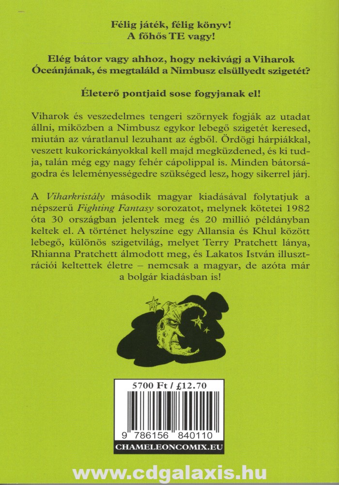 Elég bátor vagy ahhoz, hogy nekivágj a Viharok Óceánjának, és megtaláld a Nimbusz elsüllyedt szigetét? Életerő pontjaid sose fogyjanak el! Viharok és veszedelmes tengeri szörnyek fogják az utadat állni, miközben a Nimbusz egykor lebegő szigetét keresed, miután az váratlanul lezuhant az égből. Ördögi hárpiákkal, veszett kukorickányokkal kell majd megküzdened, és ki tudja, talán még egy nagy fehér cápolippal is. Minden bátorságodra és leleményességedre szükséged lesz, hogy sikerrel járj. A Viharkristály második magyar kiadásával folytatjuk a népszerű Fighting Fantasy sorozatot, melynek kötetei 1982 óta 30 országban jelentek meg és 20 millió példányban keltek el. A történet helyszíne egy Allansia és Khul között lebegő, különös szigetvilág, melyet Terry Pratchett lánya, Rhianna Pratchett álmodott meg, és Lakatos István illusztrációi keltettek életre - nemcsak a magyar, de azóta már a bolgár kiadásban is!