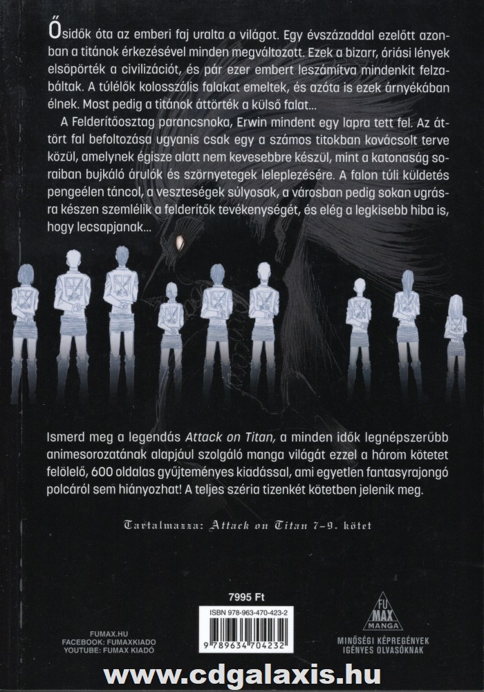 Ősidők óta az emberi faj uralta a világot. Egy évszázaddal ezelőtt azonban a titánok érkezésével minden megváltozott. Ezek a bizarr, óriási lények elsöpörték a civilizációt, és pár ezer embert leszámítva mindenkit felzabáltak. A túlélők kolosszális falakat emeltek, és azóta is ezek árnyékában élnek. Most pedig a titánok áttörték a külső falat… A Felderítőosztag parancsnoka, Erwin mindent egy lapra tett fel. Az áttört fal befoltozása ugyanis csak egy a számos titokban kovácsolt terve közül, aminek égisze alatt nem kevesebbre készült, mint leleplezni a katonaság soraiban bujkáló árulókat és szörnyetegeket. A falon túli küldetés pengeélen táncol, a veszteségek nagyok, a városban pedig sokan ugrásra készen szemlélik a felderítők tevékenységét, és elég a legkisebb hiba is, hogy lecsapjanak… Ismerd meg a legendás Attack on Titan, a minden idők legnépszerűbb animesorozatának alapjául szolgáló manga világát ezzel a három kötetet felölelő, 600 oldalas gyűjteményes kiadással, ami egyetlen fantasyrajongó polcáról sem hiányozhat! A teljes széria tizenkét kötetben jelenik meg. Tartalmazza: Attack on Titan 7-9. kötet