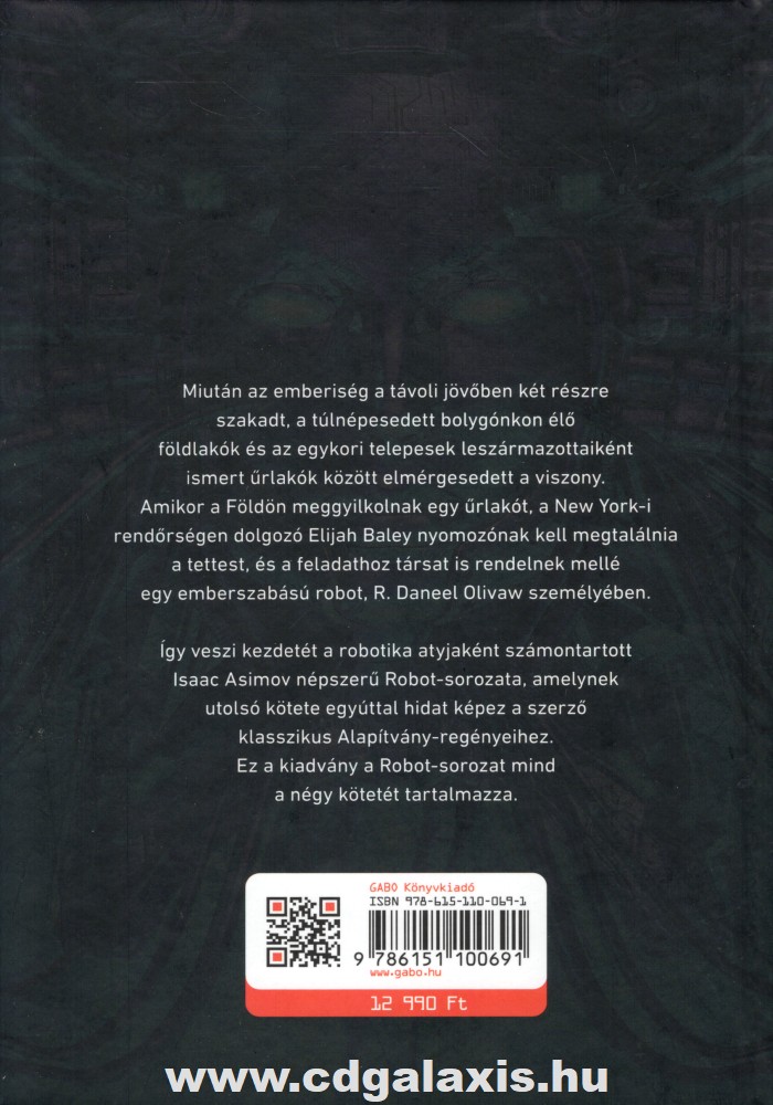 Miután az emberiség a távoli jövőben két részre szakadt, a túlnépesedett bolygónkon élő földlakók és az egykori telepesek leszármazottaiként ismert űrlakók között elmérgesedett a viszony. Amikor a Földön meggyilkolnak egy űrlakót, a New York-i rendőrségen dolgozó Elijah Baley nyomozónak kell megtalálnia a tettest, és a feladathoz társat is rendelnek mellé egy emberszabású robot, R. Daneel Olivaw személyében. Így veszi kezdetét a robotika atyjaként számontartott Isaac Asimov népszerű Robot-sorozata, amelynek utolsó kötete egyúttal hidat képez a szerző klasszikus Alapítvány-regényeihez. Ez a kiadvány a Robot-sorozat mind a négy kötetét tartalmazza.