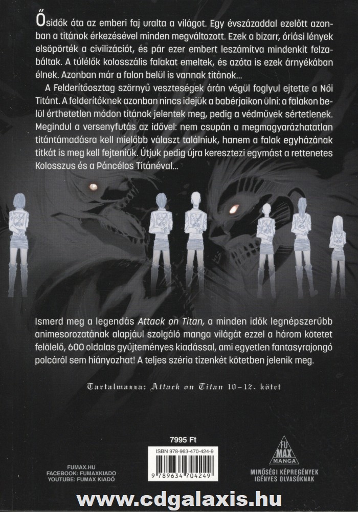 Ősidők óta az emberi faj uralta a világot. Egy évszázaddal ezelőtt azonban a titánok érkezésével minden megváltozott. Ezek a bizarr, óriási lények elsöpörték a civilizációt, és pár ezer embert leszámítva mindenkit felzabáltak. A túlélők kolosszális falakat emeltek, és azóta is ezek árnyékában élnek. Azonban már a falon belül is vannak titánok… A Felderítőosztag szörnyű veszteségek árán végül foglyul ejtette a Női Titánt. A felderítőknek azonban nincs ideje a babérjaikon ülni: a falakon belül érthetetlen módon titánok jelentek meg, pedig a védművek sértetlenek. Megindul a versenyfutás az idővel: nem csupán a megmagyarázhatatlan titántámadásra kell mielőbb választ találniuk, de a falak egyházának titkát is meg kell fejteniük. Útjuk pedig újra keresztezi egymást a rettenetes Kolosszus és Páncélos Titánéval… Ismerd meg a legendás Attack on Titan, a minden idők legnépszerűbb animesorozatának alapjául szolgáló manga világát ezzel a három kötetet felölelő, 600 oldalas gyűjteményes kiadással, ami egyetlen fantasyrajongó polcáról sem hiányozhat! A teljes széria tizenkét kötetben jelenik meg. Tartalmazza: Attack on Titan 10-12. kötet