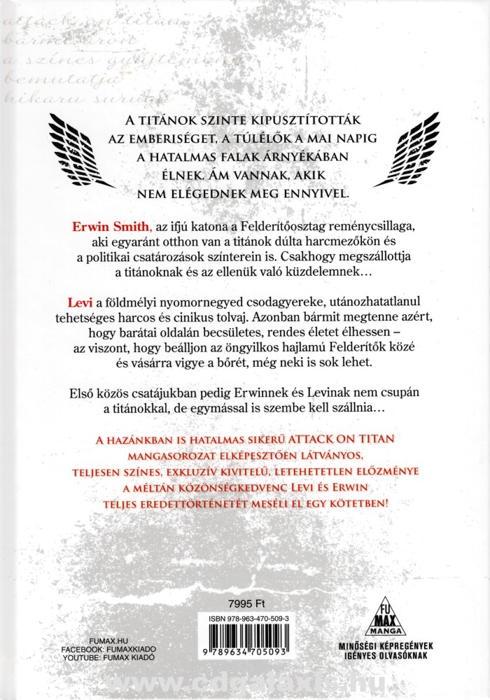 A titánok szinte kipusztították az emberiséget, a túlélők a mai napig a hatalmas falak árnyékában élnek. Ám vannak, akik nem elégednek meg ennyivel. Erwin Smith, az ifjú katona a Felderítőosztag reménycsillaga, aki egyaránt otthon van a titánok dúlta harcmezőkön és a politikai csatározások színterein is. Csakhogy megszállottja a titánoknak és az ellenük való küzdelemnek… Levi a földmélyi nyomornegyed csodagyereke, utánozhatatlanul tehetséges harcos és cinikus tolvaj. Azonban bármit megtenne azért, hogy barátai oldalán becsületes, rendes életet élhessen - az viszont, hogy beálljon az öngyilkos hajlamú Felderítők közé és vásárra vigye a bőrét, még neki is sok lehet. A két vezéregyéniség ütközése a találkozásuktól kezdve elkerülhetetlen. A kérdés csak, melyikük nyeri meg ezt az első, közös ütközetet. A hazánkban is hatalmas sikerű ATTACK ON TITAN mangasorozat elképesztően látványos, teljesen színes, exkluzív kivitelű, letehetetlen előzménye a méltán közönségkedvenc Levi és Erwin teljes eredettörténetét meséli el egy kötetben!