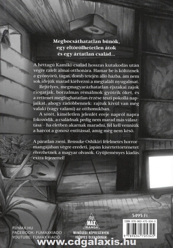Megbocsáthatatlan bűnök, egy eltörölhetetlen átok és egy ártatlan család… A héttagú Kamiki-család hosszas kutakodás után végre rálelt álmai otthonára. Hamar be is költöznek a gyönyörű, tágas, domb tetején álló házba, ám nem sok idejük marad kiélvezni a megtalált nyugalmat. Rejtélyes, megmagyarázhatatlan éjszakai zajok riogatják, borzalmas rémálmok gyötrik őket, és a rettenet megfoghatatlan érzése teszi pokollá napjaikat, ahogy rádöbbennek: rajtuk kívül van még valaki (vagy valami) az otthonukban. A sötét, kíméletlen jelenlét ereje napról napra fokozódik, a családnak pedig nem marad más választása - ha életben akarnak maradni, fel kell venniük a harcot a gonosz entitással, amíg még nem késő. A páratlan zseni, Oshikiri Rensuke félelmetes horrormangájában végre eredeti, japán kísértettörténetet élvezhetnek a magyar olvasók. Gyűjteményes kiadás extra fejezettel!