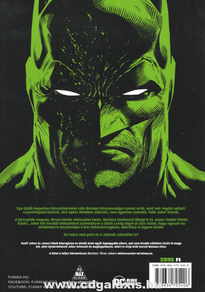 Egy újabb kegyetlen bűncselekmény után Batman bizonyosságot szerez arról, amit már régóta sejtett: a pszichopata bűnöző, akit egész életében üldözött, nem egyetlen személy. Több Joker létezik. A bizonyíték megvan, Bruce immár válaszokat keres. Barbara Gordonnal (Batgirl) és Jason Toddal (Vörös Sisak), Joker két korábbi áldozatával szövetkezve a Sötét Lovag végre jó úton halad, hogy egyszer és mindenkorra leszámoljon a bűn bohóchercegével, akárhány is legyen belőle. De vajon nem pont ez volt a Jokerek szándéka is? Geoff Johns és Jason Fabok képregénye az elmúlt évek egyik legnagyobb sikere, ami nem kisebb vállalást tűzött ki maga elé, mint újraértelmezni Joker mítoszát és megfogalmazni, miért is vívja örök harcát Batman ellen. A kötet a teljes háromrészes Batman: Three Jokers minisorozatot tartalmazza.