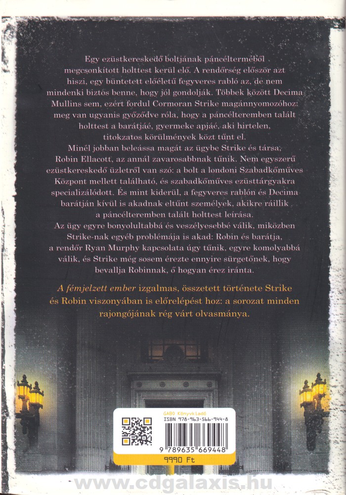 Egy ezüstkereskedő boltjának páncélterméből megcsonkított holttest kerül elő. A rendőrség először azt hiszi, egy büntetett előéletű fegyveres rabló az, de nem mindenki biztos benne, hogy jól gondolják. Többek között Decima Mullins sem, ezért fordul Cormoran Strike magánnyomozóhoz: meg van ugyanis győződve róla, hogy a páncélteremben talált holttest a barátjáé, gyermeke apjáé, aki hirtelen, titokzatos körülmények közt tűnt el. Minél jobban beleássa magát az ügybe Strike és társa, Robin Ellacott, az annál zavarosabbnak tűnik. Nem egyszerű ezüstkereskedő üzletről van szó: a bolt a londoni Szabadkőműves-központ mellett található, és szabadkőműves ezüsttárgyakra specializálódott. És mint kiderül, a fegyveres rablón és Decima barátján kívül is akadnak eltűnt személyek, akikre ráillik a páncélteremben talált holttest leírása. Az ügy egyre bonyolultabbá és veszélyesebbé válik, miközben Strike-nak egyéb problémája is akad: Robin és barátja, a rendőr Ryan Murphy kapcsolata úgy tűnik, egyre komolyabbá válik, és Strike még sosem érezte ennyire sürgetőnek, hogy bevallja Robinnak, ő hogyan érez iránta. A fémjelzett ember izgalmas, összetett története Strike és Robin viszonyában is előrelépést hoz: a sorozat minden rajongójának rég várt olvasmánya.