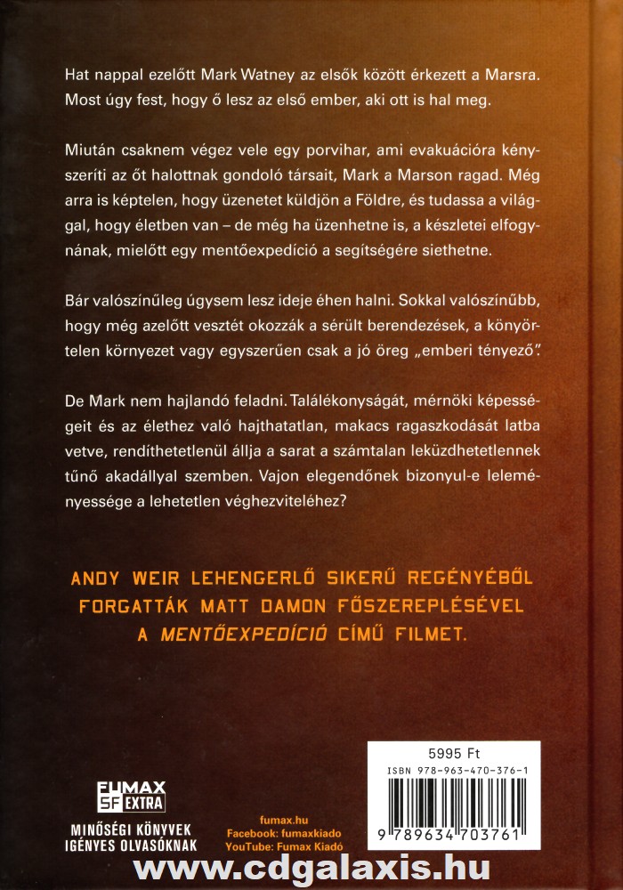 AZ UTÓBBI ÉVEK LEGNAGYOBB SCI-FI SZENZÁCIÓJA, AMELYBŐL RIDLEY SCOTT FORGATOTT FILMET. A GRAVITÁCIÓ CÍMŰ FILMHEZ HASONLÓAN EZ A KÖNYV IS MEGHÓDÍTOTTA A SZÉLESEBB KÖZÖNSÉGET. Hat nappal ezelőtt Mark Watney az elsők között érkezett a Marsra. Most úgy fest, hogy ő lesz az első ember, aki ott is hal meg. Miután csaknem végez vele egy porvihar, ami evakuációra kényszeríti az őt halottnak gondoló társait, Mark a Marson ragad. Még arra is képtelen, hogy üzenetet küldjön a Földre, és tudassa a világgal, hogy életben van - de még ha üzenhetne is, a készletei elfogynának, mielőtt egy mentőakció a segítségére siethetne. Bár valószínűleg úgysem lesz ideje éhen halni. Sokkal valószínűbb, hogy még azelőtt vesztét okozzák a sérült berendezések, a könyörtelen környezet vagy egyszerűen csak a jó öreg emberi tényező. De Mark nem hajlandó feladni. Találékonyságát, mérnöki képességeit és az élethez való hajthatatlan, makacs ragaszkodását latba vetve, rendíthetetlenül állja a sarat a számtalan leküzdhetetlennek tűnő akadállyal szemben. Vajon elegendőnek bizonyul-e leleményessége a lehetetlen véghezviteléhez?