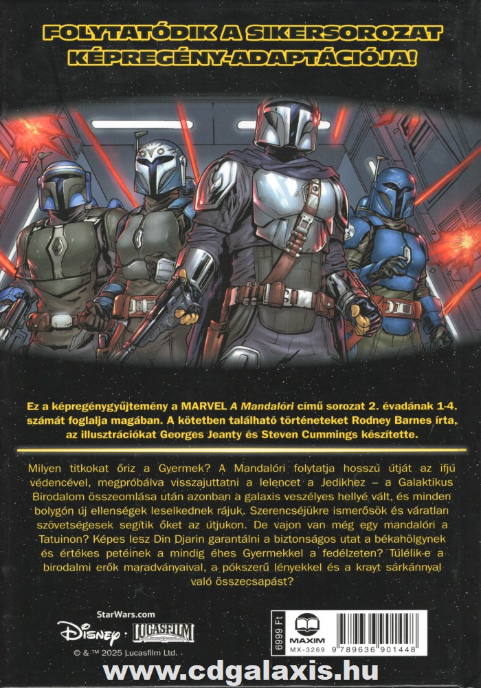 Folytatódik a sikersorozat képregény-adaptációja! Ez a képregénygyűjtemény a MARVEL A Mandalóri című sorozat 2. évadának 1-4. számát foglalja magában. A kötetben található történeteket Rodney Barnes írta, az illusztrációkat Georges Jeanty és Steven Cummings készítette. Milyen titkokat őriz a Gyermek? A Mandalóri folytatja hosszú útját az ifjú védencével, megpróbálva visszajuttatni a lelencet a Jedikhez - a Galaktikus Birodalom összeomlása után azonban a galaxis veszélyes hellyé vált, és minden bolygón új ellenségek leselkednek rájuk. Szerencséjükre ismerősök és váratlan szövetségesek segítik őket az útjukon. De vajon van még egy mandalóri a Tatuinon? Képes lesz Din Djarin garantálni a biztonságos utat a békahölgynek és értékes petéinek a mindig éhes Gyermekkel a fedélzeten? Túlélik-e a birodalmi erők maradványaival, a pókszerű lényekkel és a krayt sárkánnyal való összecsapást?