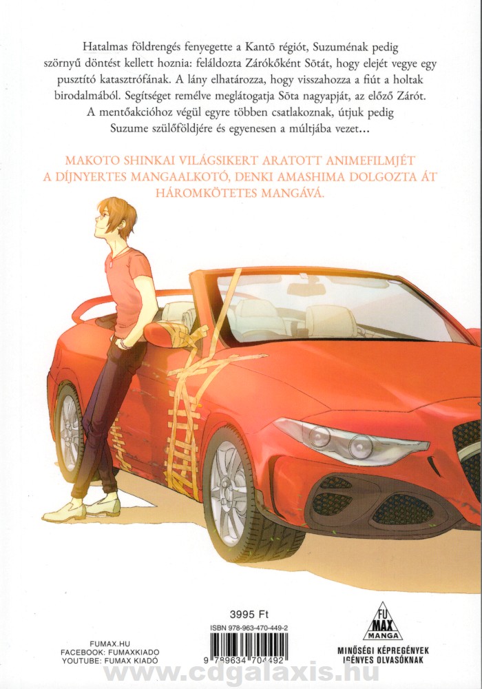 Hatalmas földrengés fenyegette a Kanto régiót, Suzuménak pedig szörnyű döntést kellett hoznia: feláldozta Zárókőként Sotát, hogy elejét vegye egy pusztító katasztrófának. A lány elhatározza, hogy visszahozza a fiút a holtak birodalmából. Segítséget remélve meglátogatja Sota nagyapját, az előző Zárót. A mentőakcióhoz végül egyre többen csatlakoznak, útjuk pedig Suzume szülőföldjére és egyenesen a múltjába vezet… MAKOTO SHINKAI VILÁGSIKERT ARATOTT ANIMEFILMJÉT A DÍJNYERTES MANGAALKOTÓ, DENKI AMASHIMA DOLGOZTA ÁT HÁROMKÖTETES MANGÁVÁ.