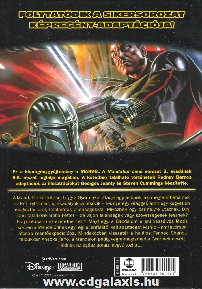 Folytatódik a sikersorozat képregény-adaptációja! Ez a képregénygyűjtemény a MARVEL A Mandalóri című sorozat 2. évadának 5-8. részét foglalja magában. A kötetben található történetek Rodney Barnes adaptációi, az illusztrációkat Georges Jeanty és Steven Cummings készítette. A Mandalóri küldetése, hogy a Gyermeket átadja egy Jedinek, aki megtaníthatja neki az Erő rejtelmeit, új akadályokba ütközik - kezdve egy világgal, amit egy kegyetlen magiszter ural, félelmetes ellenségekkel. Miközben egy ősi helyre utaznak, Din Jarin találkozik Boba Fettel - de vajon ellenségek vagy szövetségesek lesznek? És pontosan mit szeretne Fett? Majd egy, a Birodalom elleni veszélyes lépés közben a Mandalórinak egy régi ellenfelétől kell segítséget kérnie - ami gyorsan átcsap mentőexpedícióba. Mindeközben visszatér a halálos Fennec Shand, felbukkan Ahsoka Tano, a Mandalóri pedig végre megismeri a Gyermek nevét, akinek az egész sorsa megváltozhat…