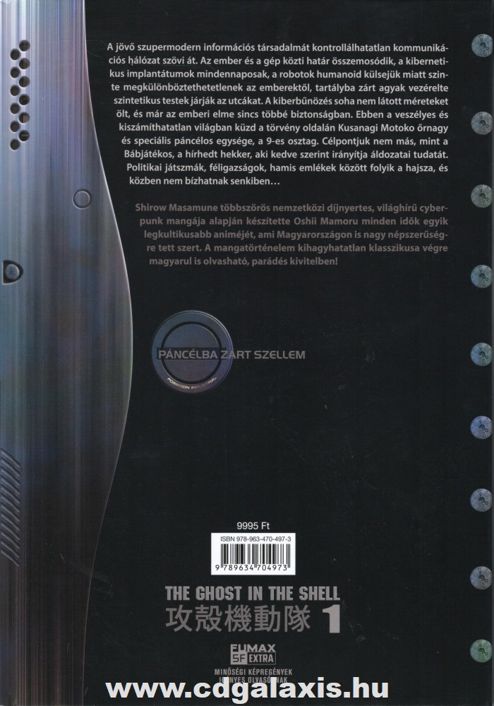 A jövő szupermodern információs társadalmát kontrollálhatatlan kommunikációs hálózat szövi át. Az ember és a gép közti határ összemosódik, a kibernetikus implantátumok mindennaposak, a robotok humanoid külsejük miatt szinte megkülönböztethetetlenek az emberektől, tartályba zárt agyak vezérelte szintetikus testek járják az utcákat. A kiberbűnözés soha nem látott méreteket ölt és már az emberi elme sincs többé biztonságban. Ebben a veszélyes és kiszámíthatatlan világban küzd a törvény oldalán Kusanagi Motoko őrnagy és speciális pácélos egysége, a 9es osztag. Célpontjuk nem más, mint a Bábjátékos, a hírhedt hekker, aki kedve szerint irányítja áldozatai tudatát. Politikai játszmák, féligazságok, hamis emlékek között folyik a hajsza, és közben nem bízhatnak senkiben… Shirow Masamune többszörös nemzetközi díjnyertes, világhírű cyberpunkmangája alapján készítette Oshii Mamoru minden idők egyik legkultikusabb animéjét, ami Magyarországon is nagy népszerűségre tett szert. A mangatörténelem kihagyhatatlan klasszikusa végre magyarul is olvasható, parádés kivitelben!