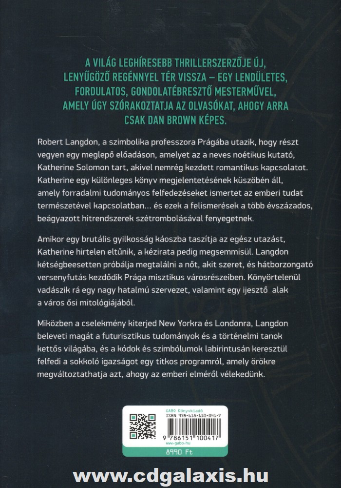 A világ leghíresebb thrillerszerzője új, lenyűgöző regénnyel tér vissza – egy lendületes, fordulatos, gondolatébresztő mesterművel, amely úgy szórakoztatja az olvasókat, ahogy arra csak Dan Brown képes.
