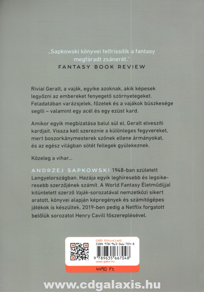 Ríviai Geralt, a vaják, egyike azoknak, akik képesek legyőzni az embereket fenyegető szörnyetegeket. Feladatában varázsjelek, főzetek és a vajákok büszkesége segíti - valamint egy acél és egy ezüst kard. Amikor egyik megbízatása balul sül el, Geralt elveszíti kardjait. Vissza kell szereznie a különleges fegyvereket, mert boszorkánymesterek szőnek ellene ármányokat, és az egész világban sötét fellegek gyülekeznek. Közeleg a vihar… Andrzej Sapkowski 1948-ban született Lengyelországban. Hazája egyik leghíresebb és legsikeresebb szerzőjének számít. A World Fantasy Életműdíjjal kitüntetett szerző Vaják-sorozatával nemzetközi sikert aratott, könyvei alapján képregények és számítógépes játékok is készültek, 2019-ben pedig a Netflix forgatott belőlük sorozatot Henry Cavill főszereplésével.
