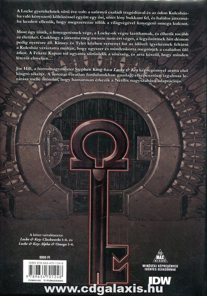A Locke-gyerekeknek sűrű éve volt: a szörnyű családi tragédiával és az ódon Kulcsházba való kényszerű költözéssel együtt egy ősi, sötét lény bukkant fel, és halálos játszmába kezdett ellenük, hogy megszerezze tőlük a világ végével fenyegető omega kulcsot. Most úgy tűnik, a fenyegetésnek vége, a Locke-ok végre lazíthatnak, és élhetik tovább az életüket. Csakhogy a játszma még messze nem ért véget, a legyőzöttnek hitt démon pedig nyerésre áll. Kinsey és Tyler közben versenyt fut az idővel: igyekeznek feltárni Kulcsház véráztatta múltját, hogy egyszer és mindenkorra megtörjék a családon ülő átkot. A Fekete Kapun túl ugyanis sűrűsödik a sötétség, és arra készül, hogy minden létezőt elnyeljen… Joe Hill, a horror mestere, Stephen King fia a Locke & Key képregénnyel aratta első kiugró sikerét. A sorozat váratlan fordulatokban gazdag, elképesztően izgalmas lezárása mellé örömhír, hogy hamarosan érkezik a Netflix nagyszabású adaptációja. A kötet tartalmazza: Locke & Key: Clockworks1-6, és Locke & Key: Alpha & Omega1-6.