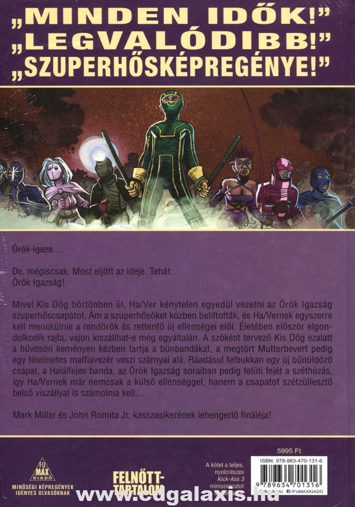 Örök Igazs… De, mégiscsak. Most eljött az ideje. Tehát: Örök Igazság! Mivel Kis Dög börtönben ül, Ha/Ver kénytelen egyedül vezetni az Örök Igazság szuperhőscsapatot. Ám a szuperhősöket közben betiltották, és Ha/Vernek egyszerre kell menekülnie a rendőrök és rettentő új ellenségei elől. Életében először elgondolkodik rajta, vajon kiszállhat-e még egyáltalán? A szökést tervező Kis Dög ezalatt a hűvösön keményen kézben tartja a bűnbandákat, a megtört Mutterbevert pedig egy félelmetes maffiavezér veszi szárnyai alá. Ráadásul felbukkan egy új bűnüldöző csapat, a Halálfejes banda, az Örök Igazság soraiban pedig felüti fejét a széthúzás, így Ha/Vernek már nemcsak a külső ellenséggel, hanem a csapatot szétzüllesztő belső viszállyal is számolnia kell… Mark Millar és John Romita Jr. kasszasikerének lehengerlő fináléja! A kötet a teljes, nyolcrészes Kick-Ass 3 minisorozatot tartalmazza.