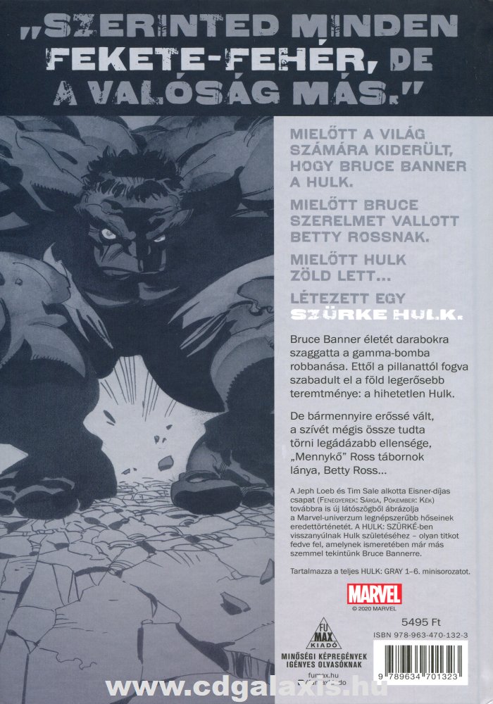 ,,Szerinted minden fekete-fehér, de a valóság más. Mielőtt a világ számára kiderült, hogy Bruce Banner a Hulk. Mielőtt Bruce szerelmet vallott Betty Rossnak. Mielőtt a Hulk zöld lett… Létezett egy szürke Hulk. Bruce Banner életét darabokra szaggatta a gamma-bomba robbanása. Ettől a pillanattól fogva szabadult el a Föld legerősebb teremtménye: a Hihetetlen Hulk. De bármennyire erőssé vált is, a szívét mégis össze tudta törni legádázabb ellensége, ,,Mennykő Ross tábornok lánya, Betty Ross… A Jeph Loeb és Time Sale alkotta, Eisner-díjas csapat (Fenegyerek: Sárga, Pókember: Kék) továbbra is új látószögből ábrázolja a Marvel Univerzum legnépszerűbb hőseinek eredettörténetét. A HULK: SZÜRKÉ-ben visszanyúlnak a Hulk születéséhez - olyan titkot fedve fel, amelynek ismeretében már más szemmel tekintünk Bruce Bannerre. Tartalmazza a teljes Hulk: Gray 1-6 minisorozatot.