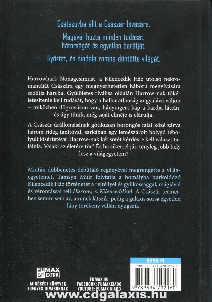 Csatasorba állt a Császár hívására. Magával hozta minden tudását, bátorságát és egyetlen barátját. Győzött, és diadala romba döntötte világát. Harrowhark Nonagesimust, a Kilencedik Ház utolsó nekromantáját Császára egy megnyerhetetlen háború megvívására szólítja harcba. Gyűlöletes riválisa oldalán Harrow-nak tökéletesítenie kell tudását, hogy a halhatatlanság angyalává váljon - miközben dögrováson van, hányingert kap a kardja láttán, és úgy tűnik, még saját elméje is elárulja. A Császár űrállomásának gótikusan borongós falai közé zárva három rideg tanítóval, sarkában egy lemészárolt bolygó tébolyult kísértetével Harrow-nak két sötét kérdésre kell választ találnia. Valaki az életére tör? És ha sikerrel jár, tényleg jobb hely lesz a világegyetem? Miután döbbenetes debütáló regényével megrengette a világegyetemet, Tamsyn Muir folytatja a homályba burkolódzó Kilencedik Ház történetét a rejtéllyel és gyilkossággal, mágiával és vérontással teli Harrow, a Kilencedikkel. A Császár termeiben semmi sem az, aminek látszik, pedig a galaxis sorsa egyetlen lány törékeny vállán nyugszik.