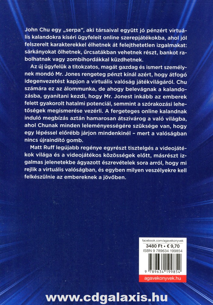 Letehetetlen regény a Ready Player One és Neal Stephenson rajongóinak!John Chu egy ,,serpa, aki társaival együtt jó pénzért virtuális kalandokra kíséri ügyfeleit online szerepjátékokba, ahol jól felszerelt karakterekkel élhetnek át felejthetetlen izgalmakat: sárkányokat ölhetnek, űrcsatákban vehetnek részt, bankot rabolhatnak vagy zombihordákkal küzdhetnek.Az új ügyfelük a titokzatos, magát gazdag és ismert személynek mondó Mr. Jones rengeteg pénzt kínál azért, hogy átfogó idegenvezetést kapjon a virtuális valóság játékvilágáról. Chu számára ez az álommunka, de ahogy belevágnak a kalandozásba, gyanítani kezdi, hogy Mr. Jonest inkább az emberek felett gyakorolt hatalmi potenciál, semmint a szórakozási lehetőségek megismerése vezérli. A fergeteges online kalandnak induló megbízás aztán hamarosan átszivárog a való világba, ahol Chunak minden leleményességére szüksége van, hogy egy lépéssel előrébb járjon mindenkinél - mert a valóságban nincs újraindító gomb.Matt Ruff legújabb regénye egyrészt tisztelgés a videojátékok világa és a videojátékos közösségek előtt, másrészt izgalmas jelenetekbe ágyazott észrevételek sora arról, hogy mi rejlik a virtuális valóságban, és egyben milyen veszélyekre kell felkészülnie az embereknek a jövőben.