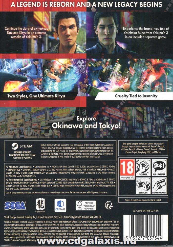 Folytasd az ex-yakuza Kazuma Kiryu történetét, aki szerettei védelméért küzd a Yakuza 3 extrém remake-jében, amely a játék minden elemét új szintre emeli. Okinawa és Tokió nyüzsgő utcái egyaránt elképesztő részletességgel kelnek életre, ahol a csaták egy újragondolt harcrendszernek köszönhetően elevenednek meg, ezzel új szintre emelve a brutális pofonosztást. Az új jelenetek révén a történet új mélységekkel és érzésekkel bővül, amit feljavított mellékes élmények és küldetések támogatnak, hogy úgy mélyülhess el ezen világban, mint még soha.